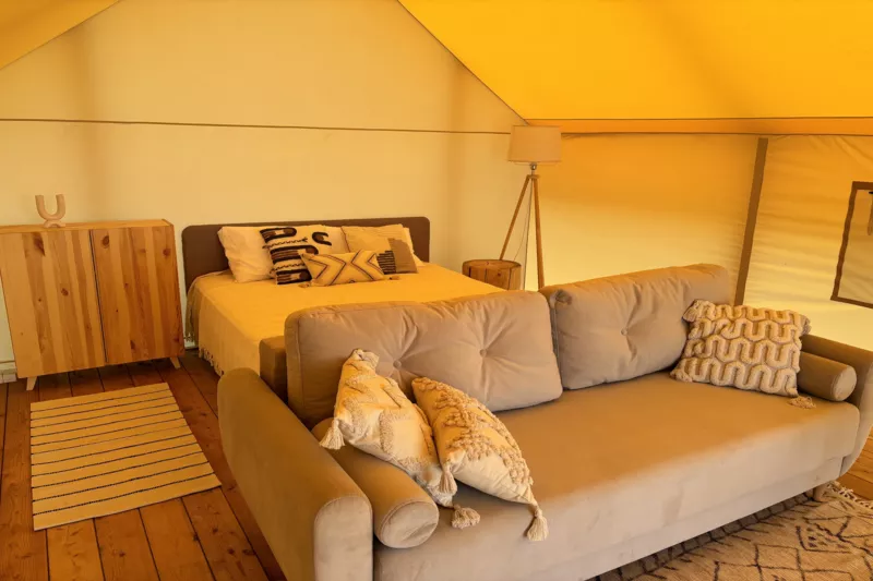Шатер оснащен всем необходимым. Внутри имеются двуспальная кровать и раскладной диван. Есть комод, зеркало, мини-холодильник, чайник, постельные принадлежности.