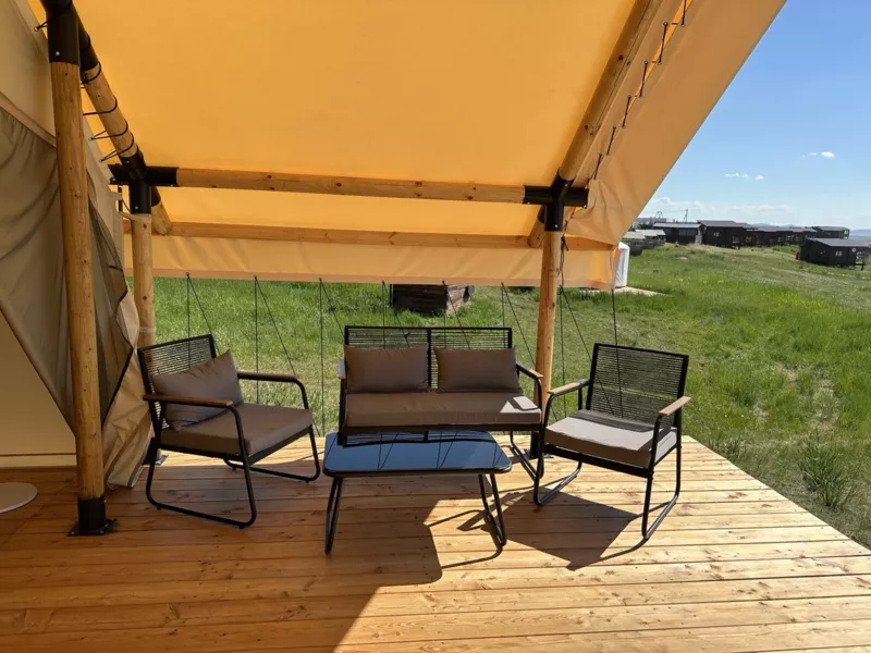 Глэмпинг расположен на возвышенности в 50 метрах от берега.